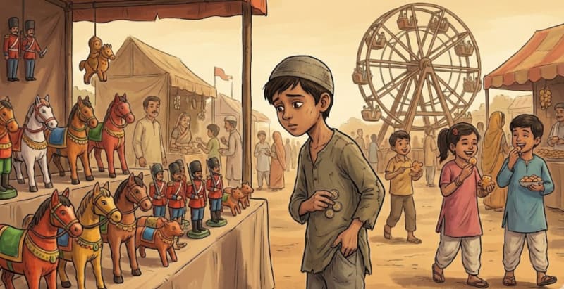 इन लोगों के खिलौने पर कौन इन्हें दुआएं देगा? बड़ों की दुआएं सीधे अल्लाह के दरबार में पहुंचती हैं, और तुरंत सुनी जाती हैं। मैं भी इनसे मिजाज क्यों सहूं? मैं गरीब सही, किसी से कुछ मांगने तो नहीं जाते। आखिर अब्बा जान कभी न कभी आएंगे। अम्मा भी आएंगी ही। फिर इन लोगों से पूछूंगा, कितने खिलौने लोगे?