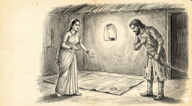 आई और मुग़ल से बोली—जाओ भीतर, थके हुए भयभीत पथिक! तुम चाहे कोई हो, मैं तुम्हें आश्रय देती हूँ। मैं ब्राह्मण-कुमारी हूँ;