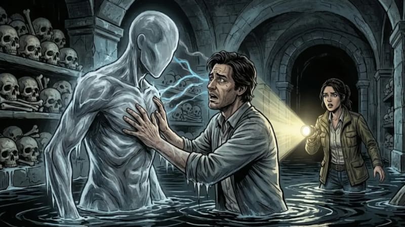 They were waist-deep in freezing, black water. Aris led the way with a high-powered flashlight, the beam cutting through the suffocating darkness. The walls were lined with recessed alcoves, stacked floor-to-ceiling with human skulls and femurs arranged in decorative patterns by long-dead monks.